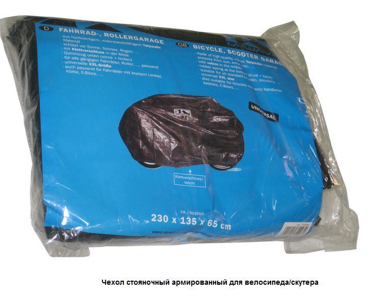 - Накидывается сверху на неразобранный припаркованный велосипед. Защищает от дождя, пыли, снега